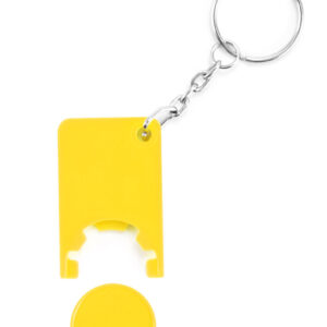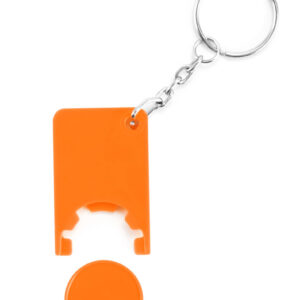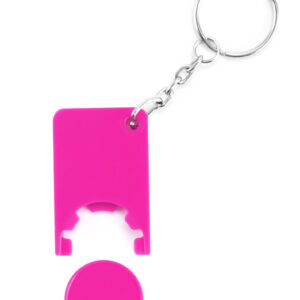 Llavero moneda en divertido diseño de variados colores y con moneda extraíble.