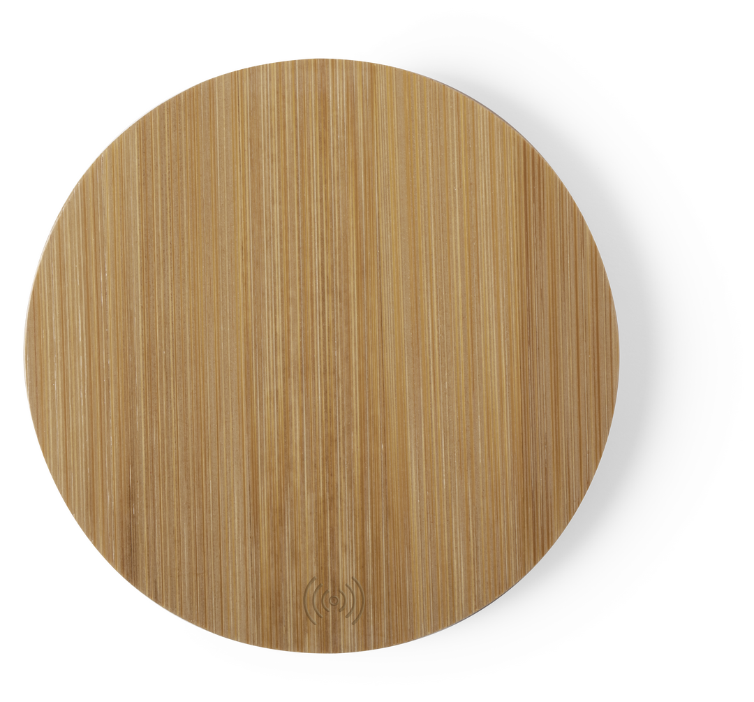 Cargador inalámbrico de línea nature y diseño circular. Carcasa en bambú procedente de cortes naturales. Indicador de estado de carga y compatible con dispositivos equipados con tecnología de carga inalámbrica. Amplia superficie de marcaje y presentado en atractiva caja de diseño eco.