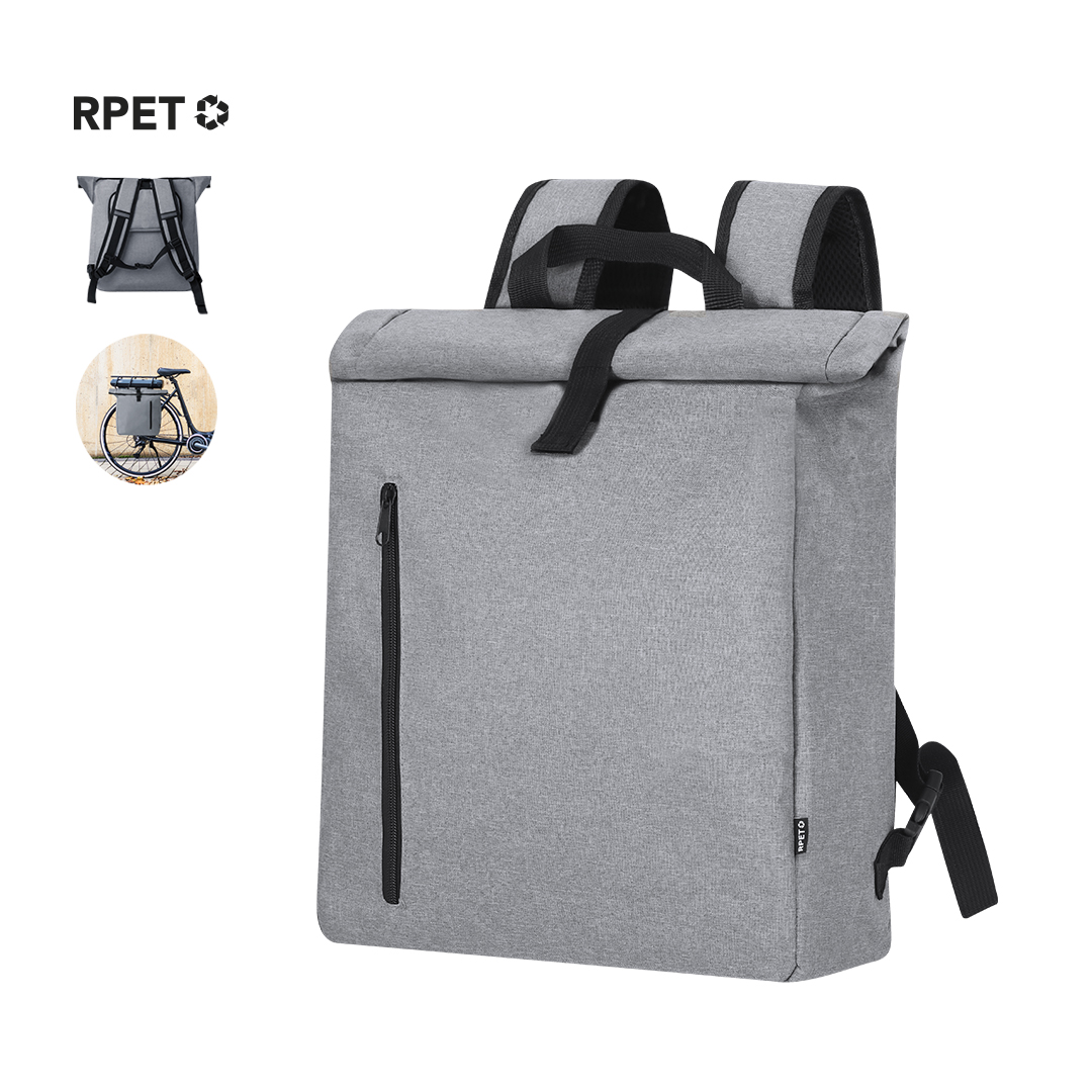 Mochila para bicicleta fabricada en resistente RPET 600D. Versátil y con cierre de hebilla, incluye un práctico bolsillo frontal con cremallera. En su parte trasera cuenta con enganches específicos universales para bicicleta, garantizando una mayor comodidad y seguridad en los desplazamientos. Además, dispone de un asas acolchadas y ajustables para los hombros, para así transportarla con mayor confort cuando se desacopla de la bicicleta. Etiqueta exterior con logotipo RPET.El material RPET se elabora a partir de plástico reciclado, para así fomentar la reutilización de residuos plásticos y ayudar a la sostenibilidad del planeta.
