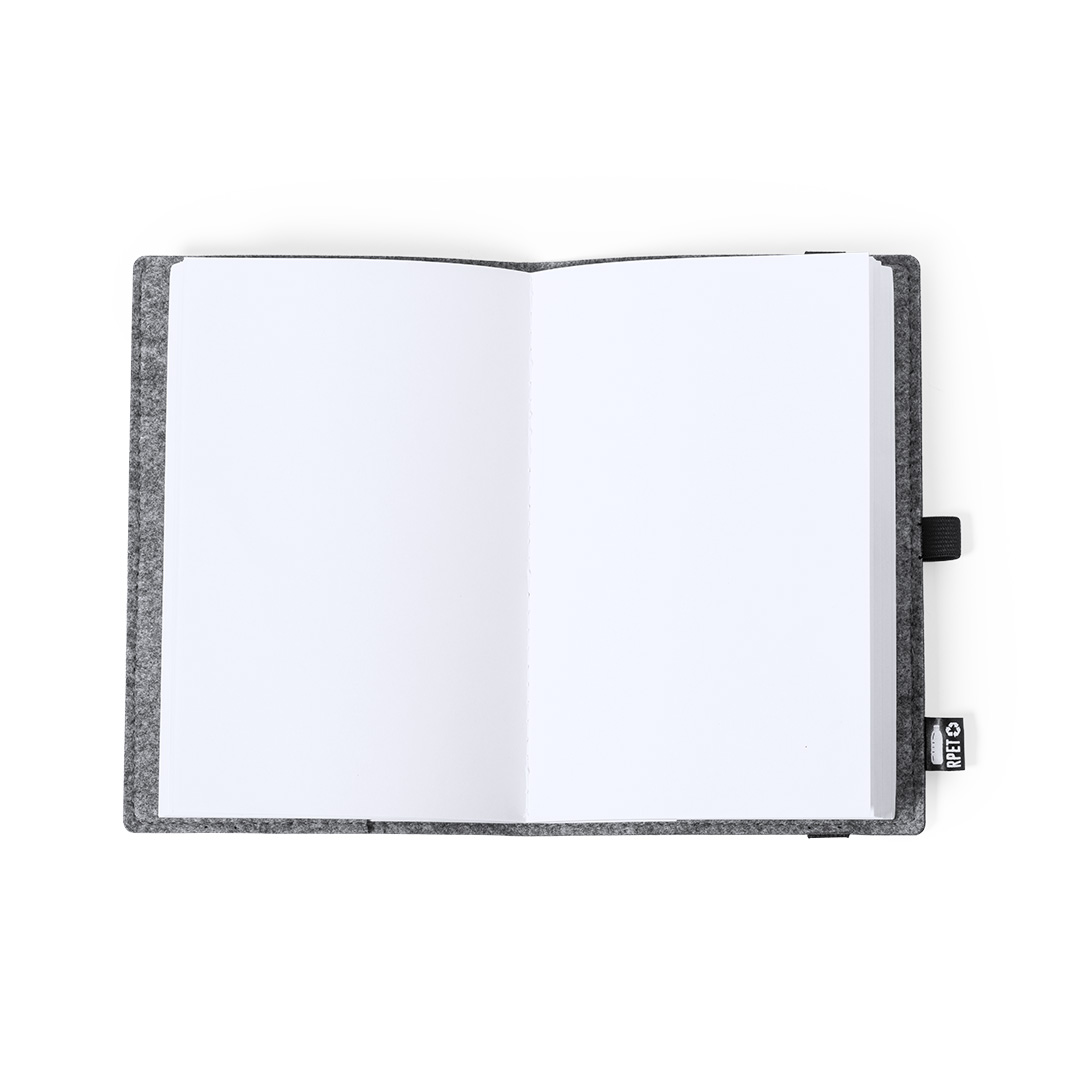 Bloc de notas A5 de línea nature con funda en fieltro RPETreciclado, fruto de la combinación del proceso de reciclaje de materiales plásticos junto con la técnica milenaria de fabricación del fieltro, dando como resultado un material de eco-tendencia que, además de ser de origen reciclado, también se convierte en reciclable.Incluye 100 hojas lisas. Con elástico de sujeción, soporte para bolígrafo y etiqueta RPET en portada.