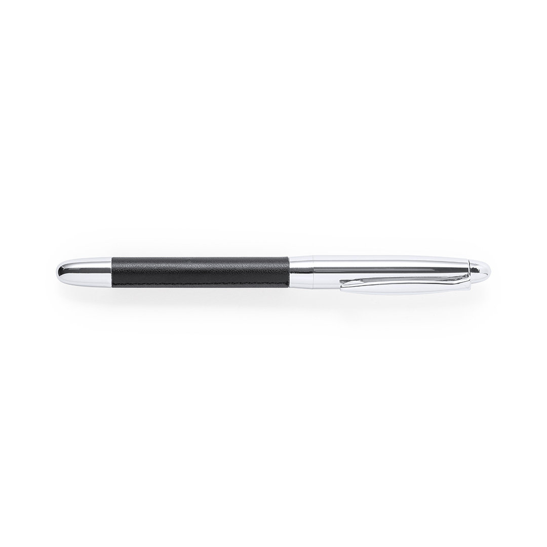 Set premium de bolígrafo y roller. Fabricado en elegante combinación de polipiel en tonos negros y metal cromado. Bolígrafo de mecanismo giratorio en tinta azul y con cartucho jumbo. Roller con capucha y tinta gel en azul, carga jumbo. Presentado en estuche individual de polipiel con cierre de cremallera e interior a juego con compartimentos individuales.