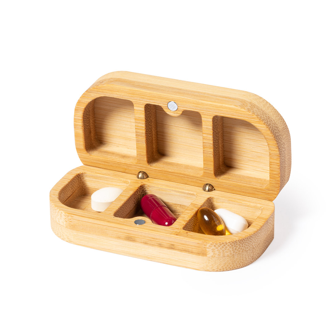 Pastillero de línea nature fabricado en bambú. Con 3 compartimentos interiores y cierre magnético.