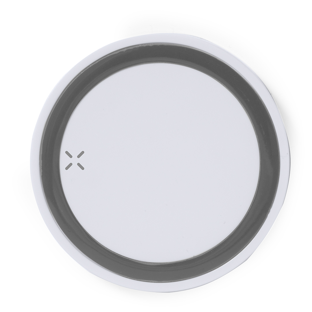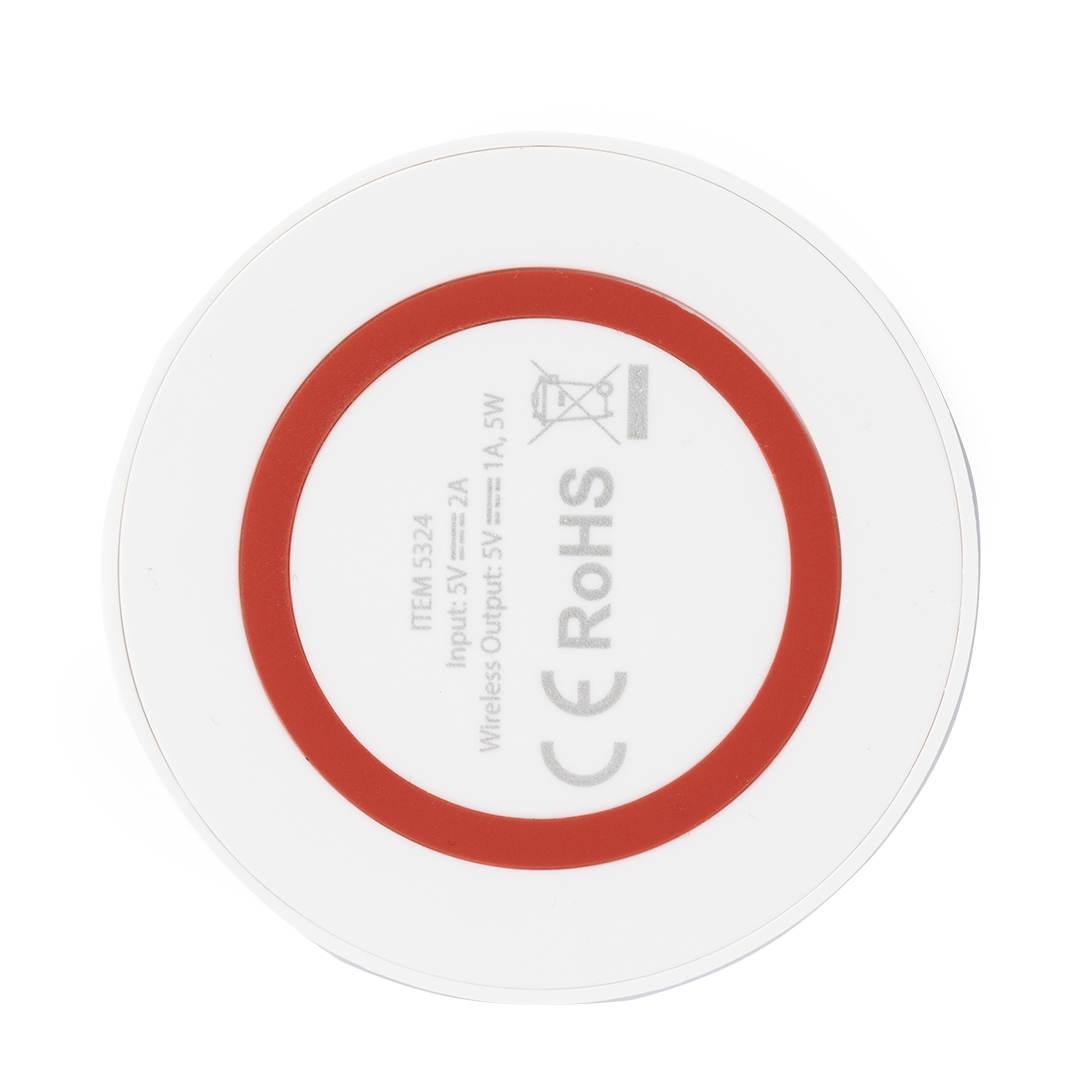 Cargador inalámbrico circular de diseño bicolor. Con base antideslizante e indicador LED de estado de carga. Compatible con smartphones con tecnología de carga inalámbrica y presentado en atractiva caja de diseño.
