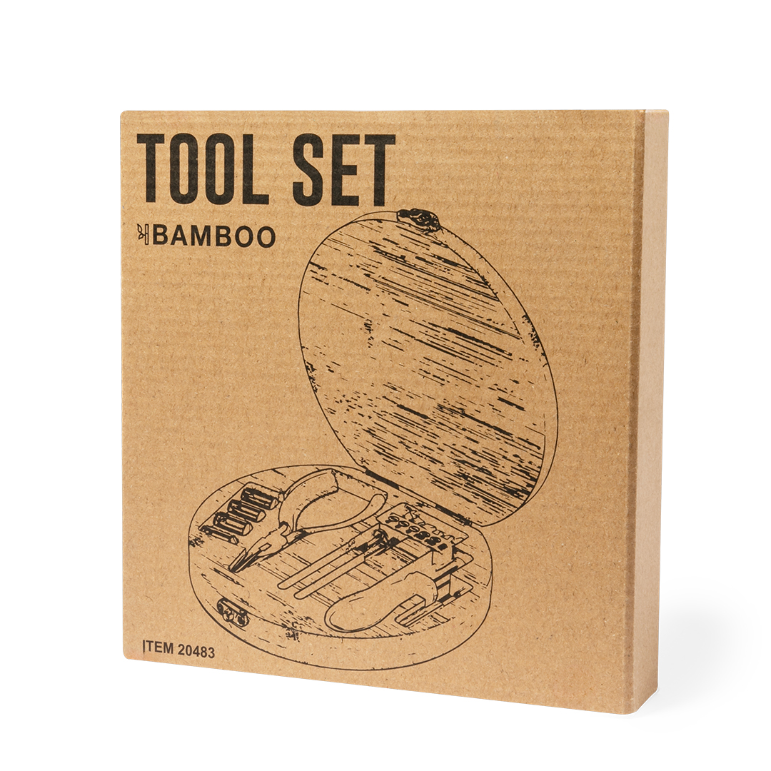 Set de herramientas presentado en resistente caja de bambú con cierre metálico. Con interior troquelado en bambú para un perfecto ajuste de las herramientas. Incluye 15 accesorios: llaves de tubo, alicates con sección cortante, destornilladores de precisión (plano y philips) y destornillador con multitud de puntas planas, philips, hexagonales y torx. Presentado en caja de diseño kraft. Materiales como el bambú fomentan la utilización de materias primas naturales, reduciendo las emisiones contaminantes. Proviene de una planta de gran resistencia y versatilidad, con crecimiento y regeneración rápidos, siendo una excelente alternativa al uso de madera tradicional.