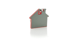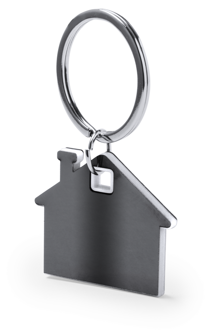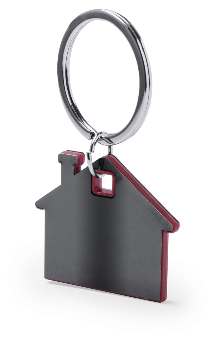 Llavero casita en original diseño con exterior en acero inox de tono gris espacial natural e interior en variada gama de colores. Presentado en bolsita individual con cartulina en elegante color gris.